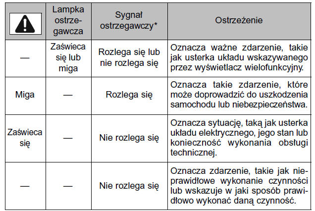 *: Sygnał ostrzegawczy rozlega się podczas pierwszego pojawienia się komunikatu na wyświetlaczu wielofunkcyjnym.